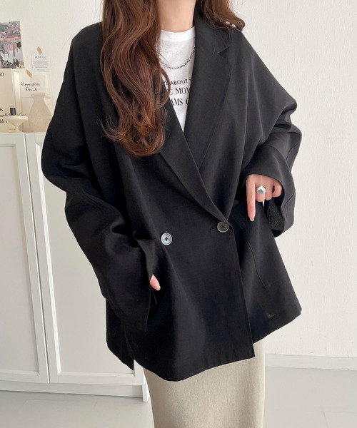 商品名:透け感が彩る、大人の余裕。麻調シアー素材ドルマンスリーブオーバーサイズダブルテーラードジャケット(長袖)