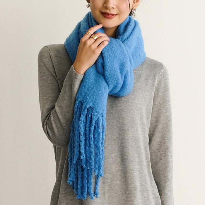 太めのフリンジと肉厚な生地感で巻き方のアレンジも楽しめます。