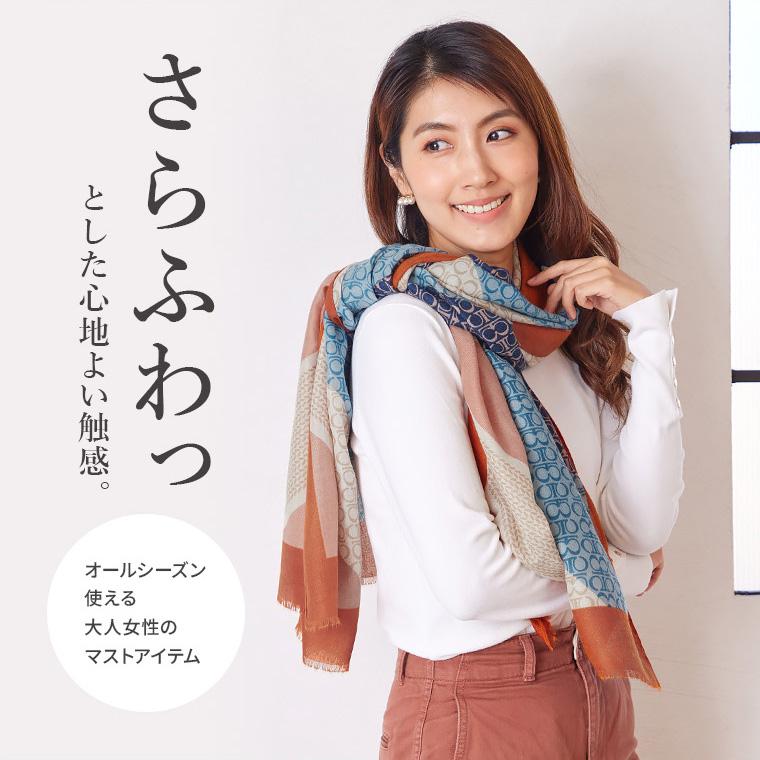 ◎ふんわりと優しい肌触りが自慢。肌触りがよくて大判なので使い方色々、コーデのポイントになります。