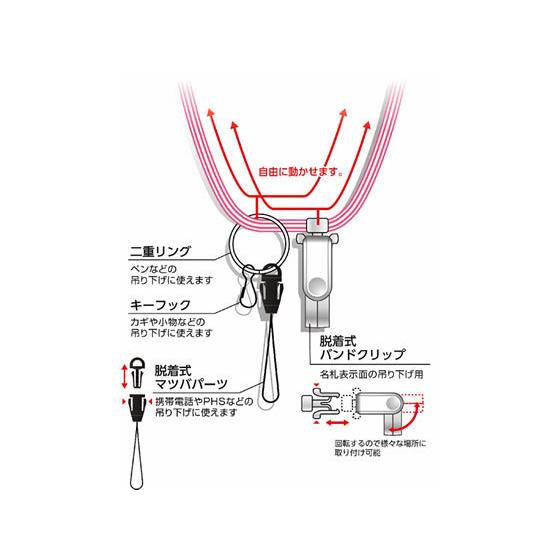IDカードや携帯電話、スマートフォンを金具に付けて首から下げることができます。