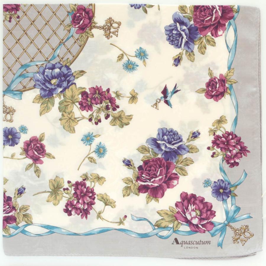Aquascutum アクアスキュータム 大判 綿シルク プリントハンカチ(58cm)庭園の花々 グレー