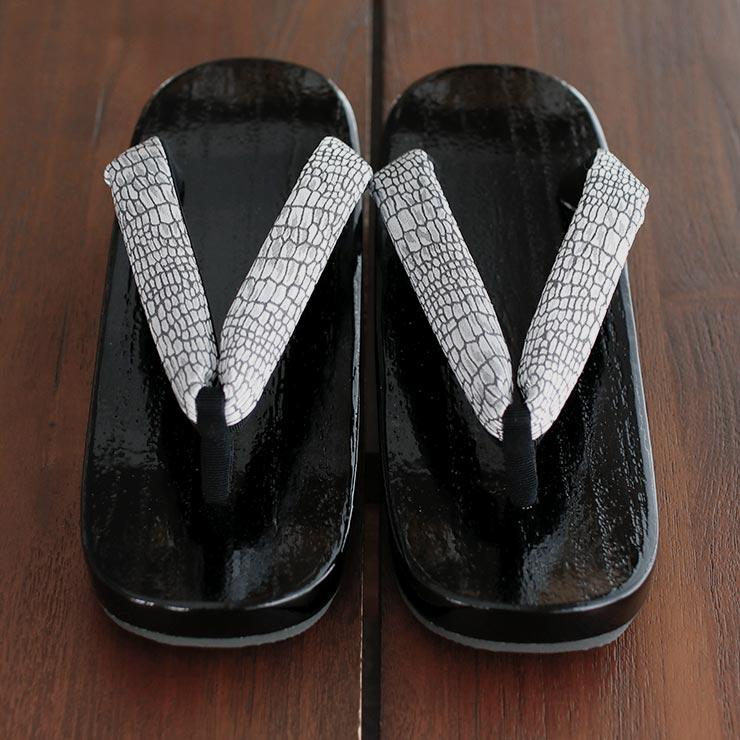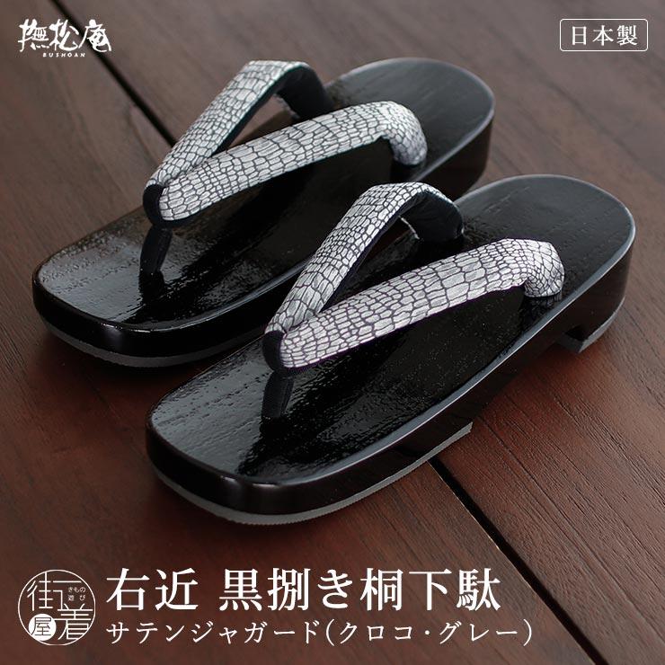 サテンジャガード 右近 黒捌き 下駄 (クロコ・グレー 85 105-377-501) レディース フリーサイズ 黒塗り 桐下駄 モダン 浴衣 ゆかた 夏きもの 単衣 撫松庵 fj506s