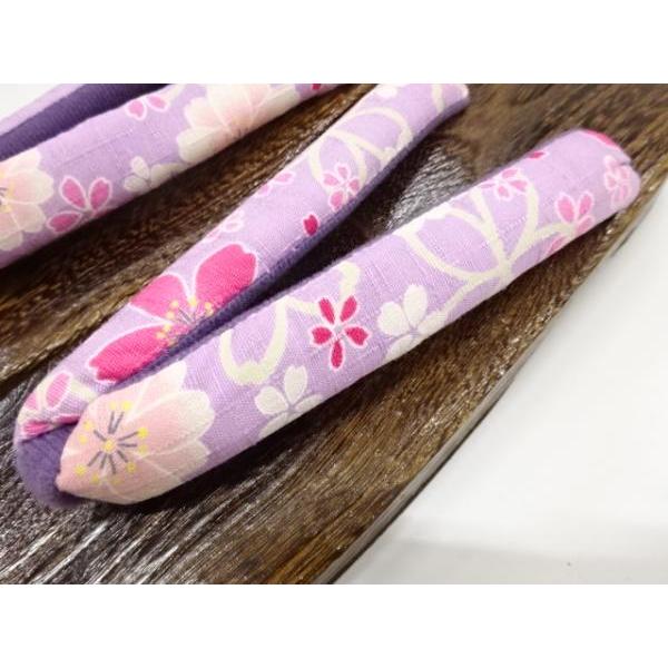 【カラー】鼻緒は紫色地に毬模様。台は焼桐の焦げ茶色。