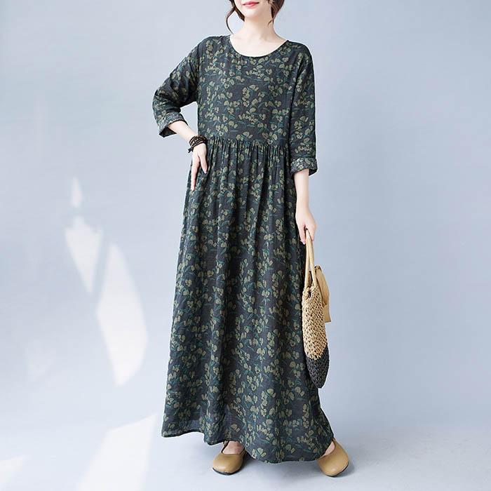 ワンピース長袖ロングワンピース花柄ロング丈ワンピレディースロングワンピクルーネック綿麻風フレアワンピースリゾートワンピース総柄ゆったり