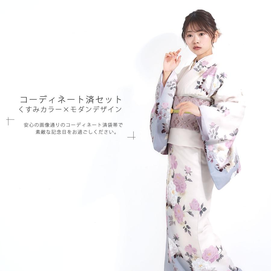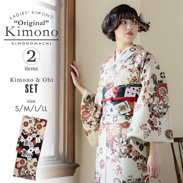 KIMONOMACHI 洗える着物 セット「袷着物:花紋散らし灰梅+京袋帯:黒トランプ」KIMONOMACHI オリジナル 着物と帯の2点セット サイズS/M/L/LL (メール便不可)ss2509kck10