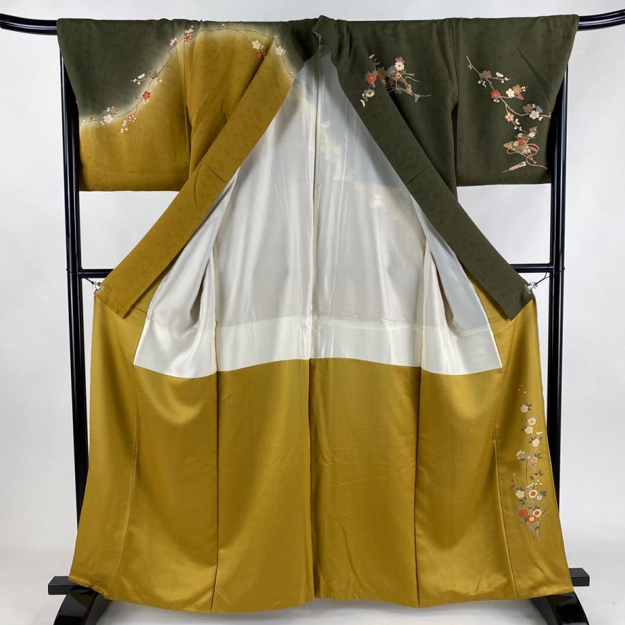 付下げ 身丈161.5cm 裄丈68cm L 袷 扇 草花 金糸 染め分け 茶緑色 正絹 秀品 中古