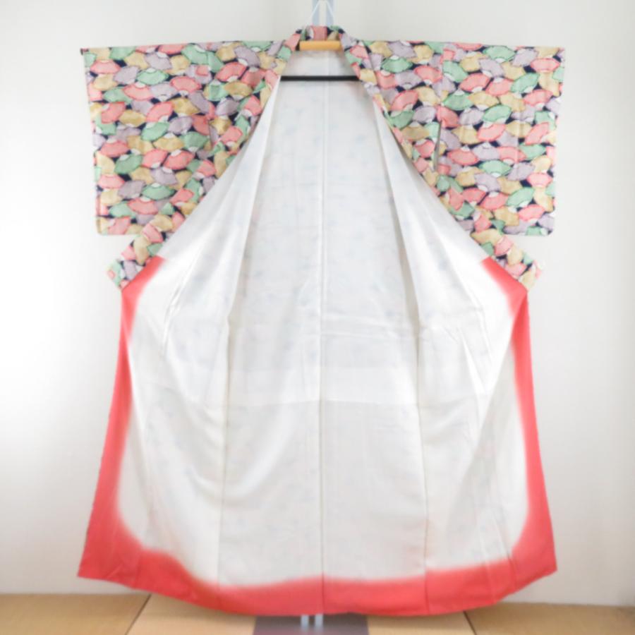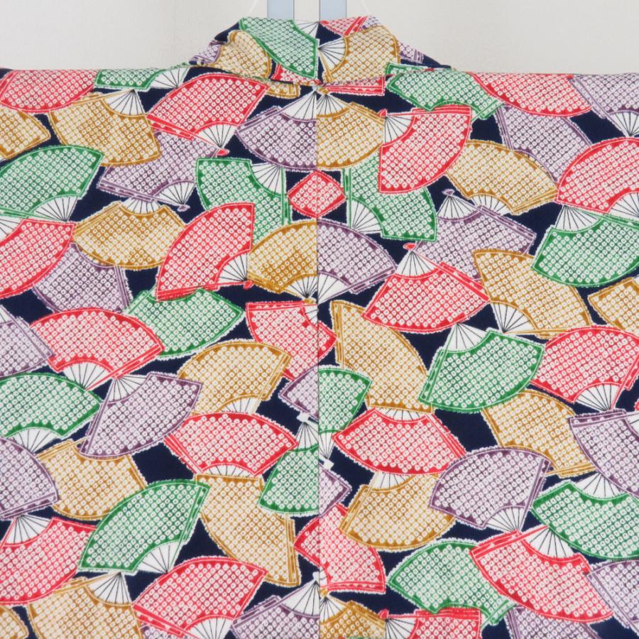 小紋 紺色x多色 扇子模様 正絹 袷 バチ衿 仕立て上がり着物 身丈154cm